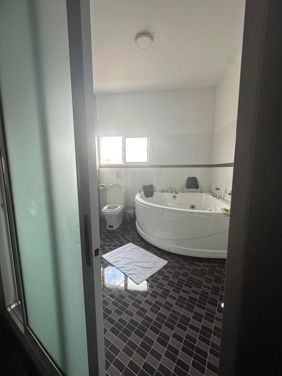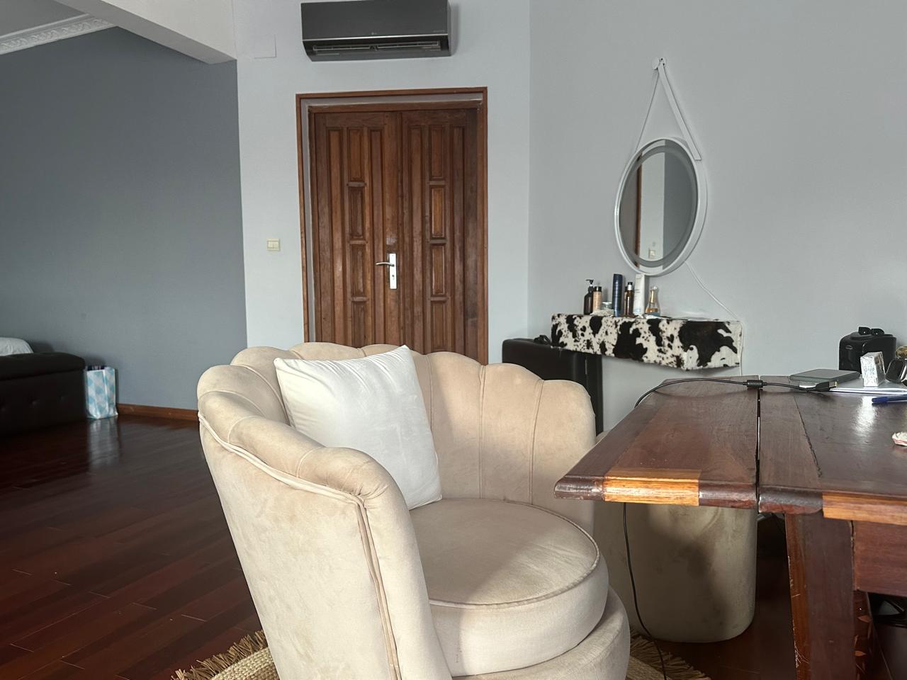 Suite spacieuse avec grands canapés, bureau, coiffeuse, salle de bains confortable, possibilité de rajouter un petit lit. Calme et espace.